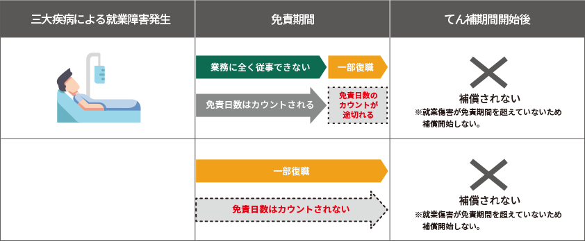 ※一部復職した際に免責期間またはてん補期間が継続するためには、就業障害となる身体障害が残存していることが必要です。