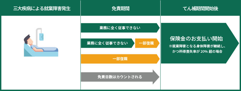 就業障害定義緩和(三大疾病)特約 - 三大疾病(がん・急性心筋梗塞および脳卒中)を被った場合、「業務に一部従事できない状態※」になり、その状態が免責期間を超えて続いた場合でも、補償対象になります。