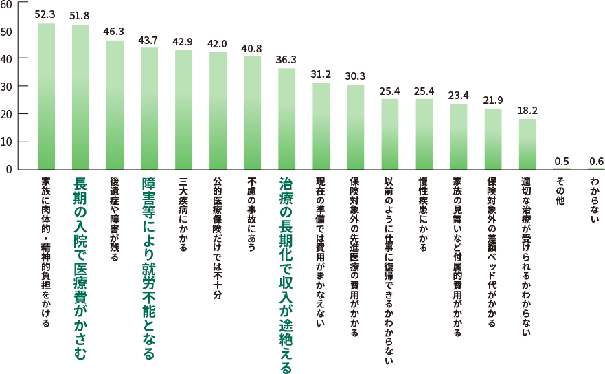 ケガや病気に対する不安の内容として「長期の入院で医療費がかさむ」や「治療の長期化で収入が途絶える」が上位にあげられています。この2つに共通するのは「長期」。従業員の方が安心して働ける環境整備のためにも、長期入院・治療に伴う収入の喪失を補うサポートが求められています。