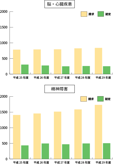脳・心臓系疾患や精神障害の労災請求件数は、ここ数年で増加する傾向にあります。特に、精神障害の労災認定については職種に関わりなく発生している現状があります。仕事に関する不安、焦り、抑うつといった心的ストレスはどこの職場にもあることを示しており、企業側には予防と対策、万一の場合の備えなど、従業員の方への総合的なケアが求められています。